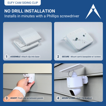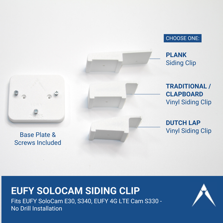 Mount your eufy SoloCam E30 or S340 securely—no drilling required. This siding clip is available in three styles to match your home’s exterior: Dutch lap vinyl, traditional vinyl (clapboard), or plank siding, such as HardiePlank or fiber cement.