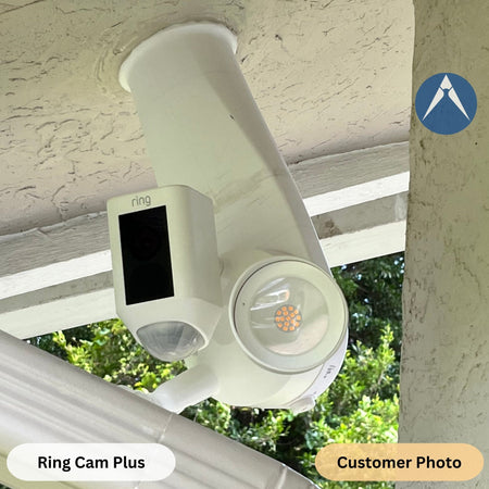This 90-degree Slim Floodlight Camera Soffit Mount is easy to install and compatible with various cameras, including Ring Cam Wired Pro, Ring Cam Wired Plus, Ring Cam Wired Gen 1, Blink Wired Floodlight, Wyze Floodlight Camera Pro, and more. It is designed and made in the USA.
